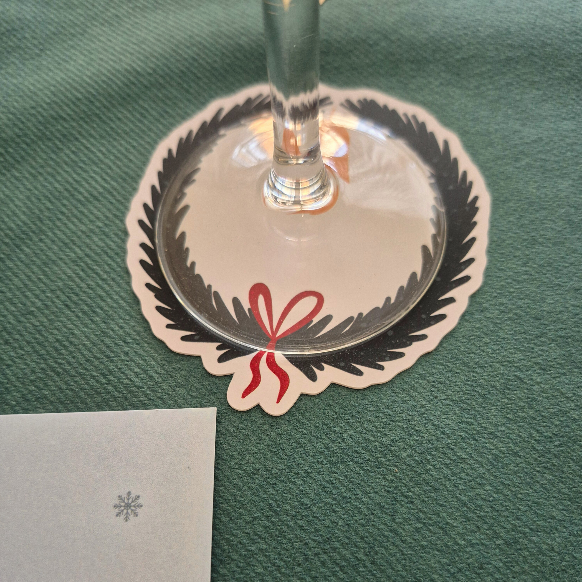 These adorable Christmas Wreath disposable coasters are a fun addition to your Christmas season tablescape! A traditional green wreath on a white background adorned with a red bow and gold bell for full festive cheer. They are designed to coordinate with other items in our Christmas Collection.