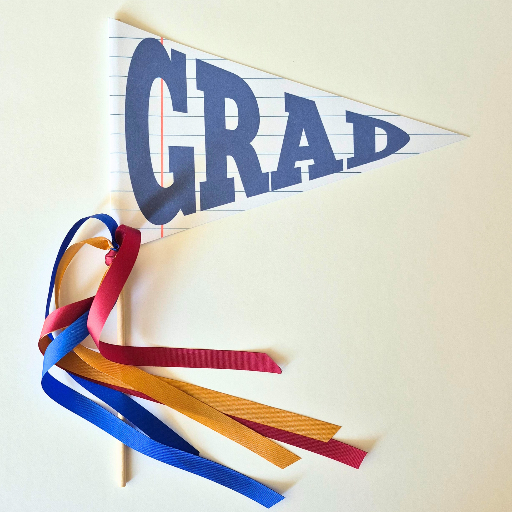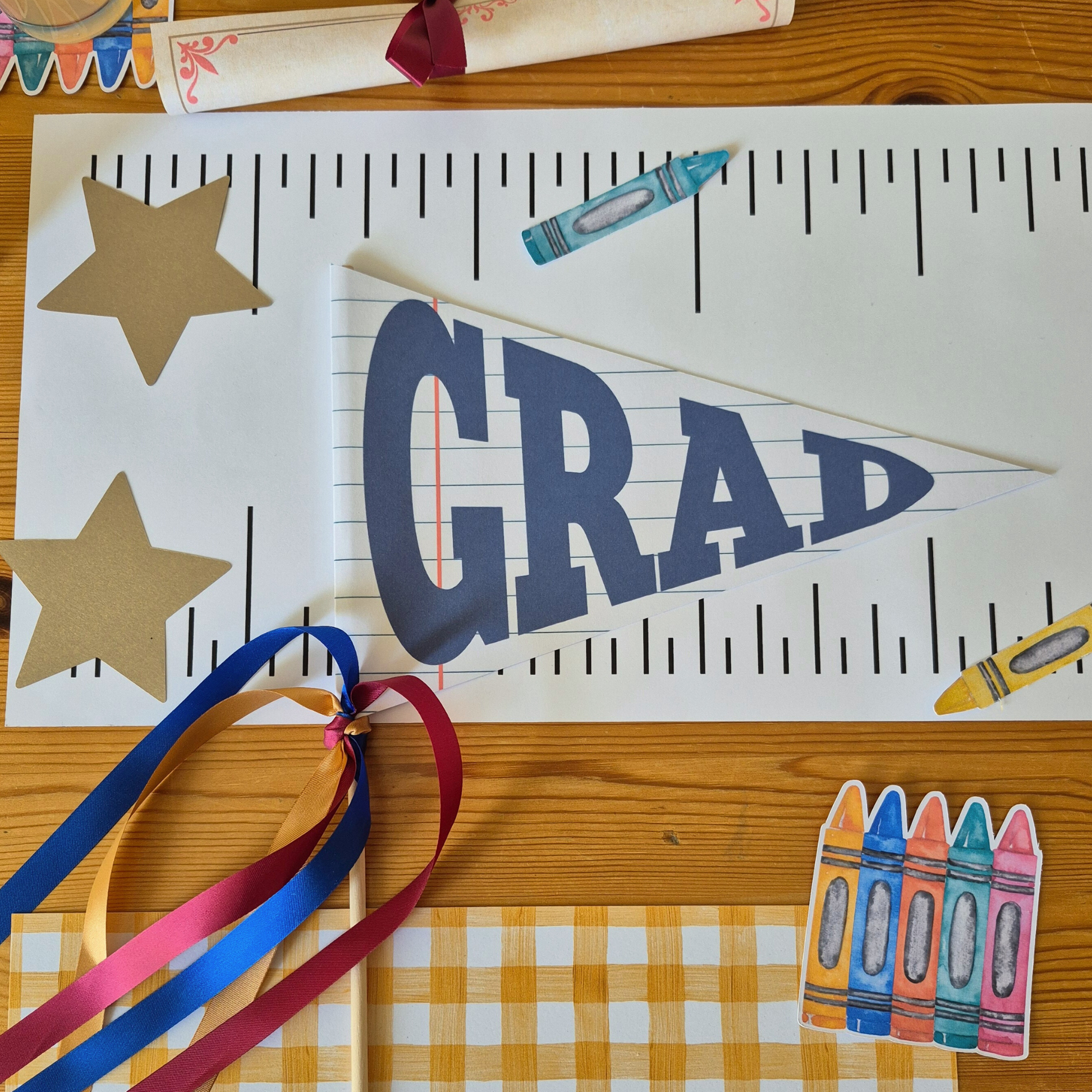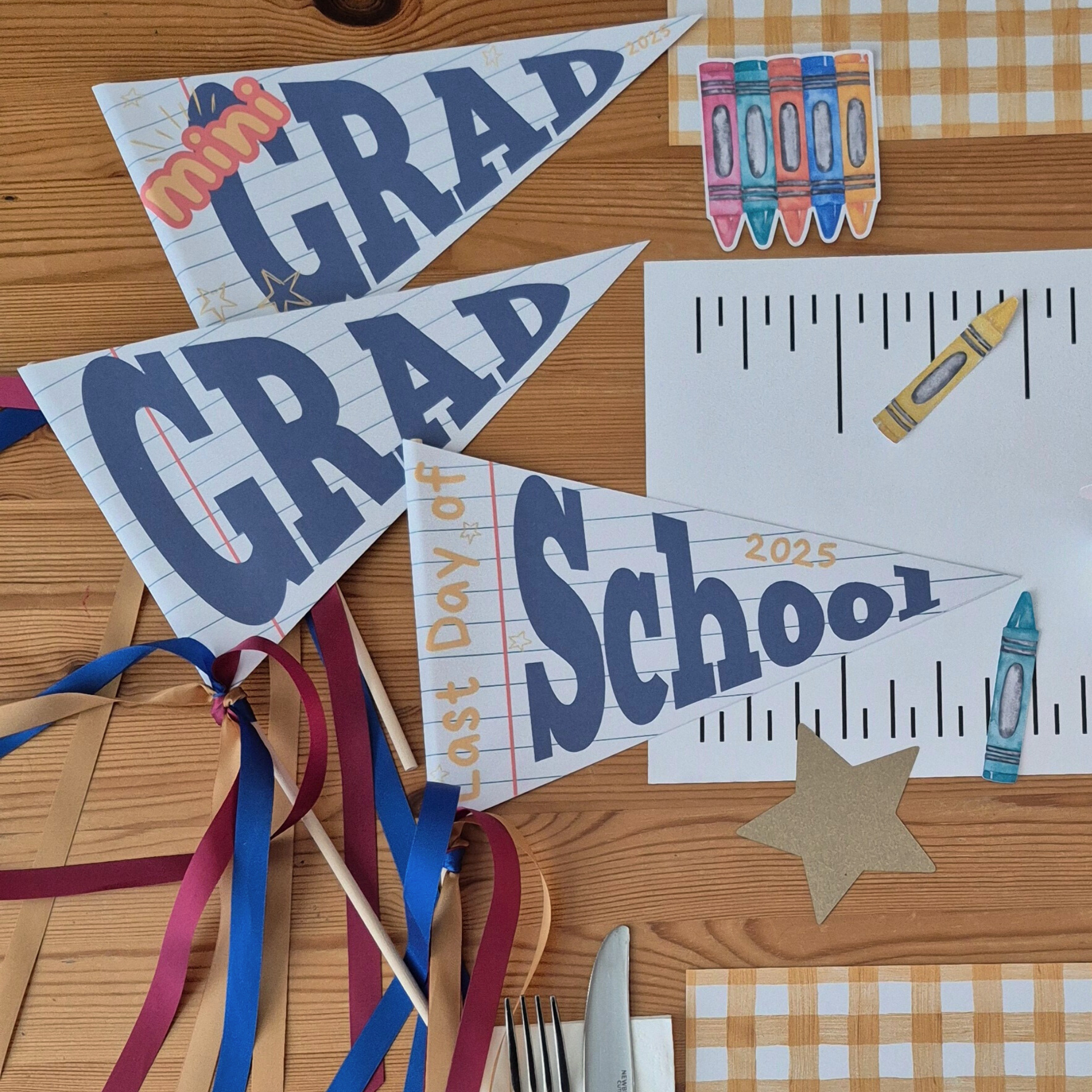 Our End of School Year Party Pennant flag collection includes thoughtful design details like old fashioned notebook paper, a Varsity font and colourful doodles for extra fun.